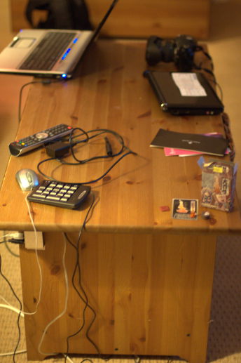 Hey look, its an ordinary, common-or-garden coffee table: well mostly ordinary, this one seems to have rather an excessive amount of laptops/serial port hacking cables on it…