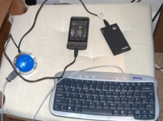 The next problem is that as far as I know the hero cannot supply power on the USB bus, and I’m not daring to try enabling the USB bus power hardware registers until I know more about how the charging circuitry is implemented. Therefore, I modified a portable USB hub to have two cables attached: one data with GND/D+/D- for connecting to the phone and one with GND/VBUS for supplying power to the hub itself. I’m powering everything off some rather nifty slimline rechargeable batteries acquired from Maplin.