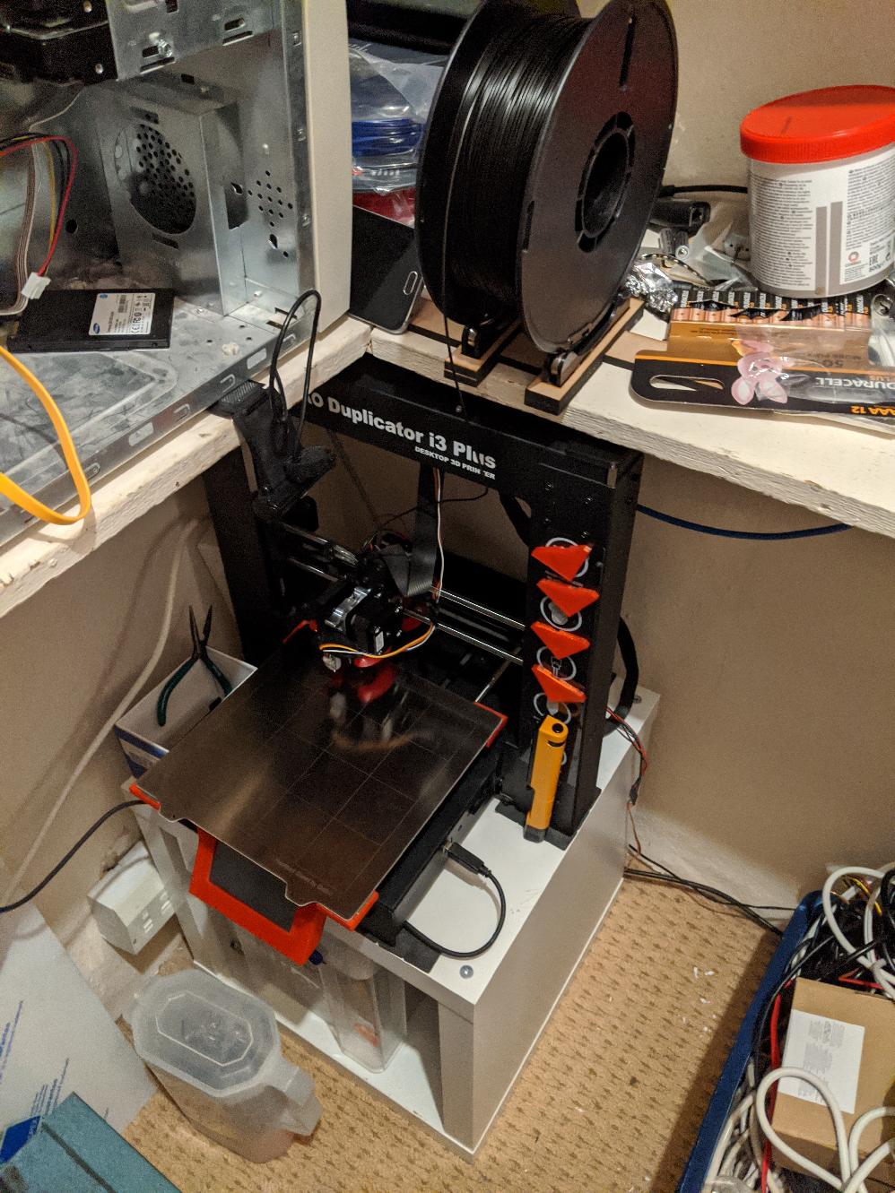 - Filament spool holder. 3D printer filament comes on a variety of differently sized spools, so I designed an adjustable spool holder with some 3d printed parts, lasercut MDF and circular bearings. It – and the spool – sit on the shelf above the printer.