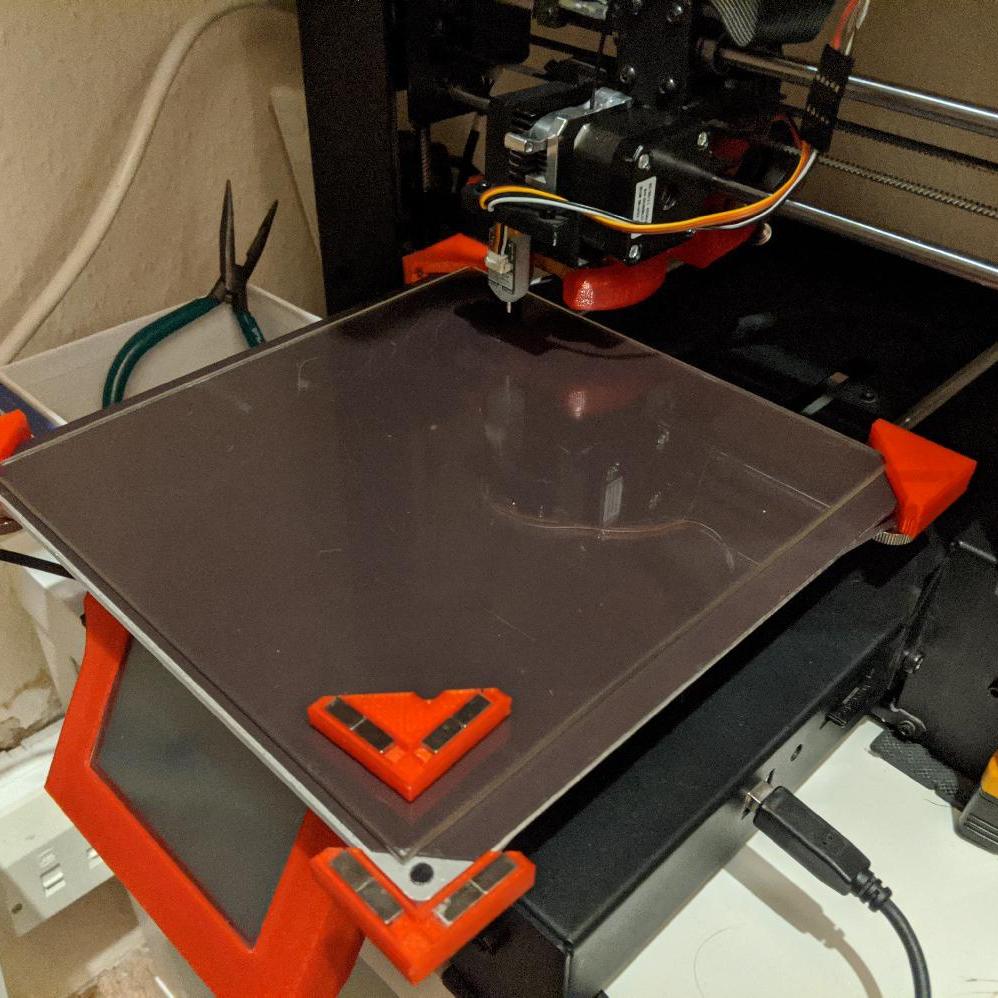 - Since glass isn’t generally magnetic, I had to make the triangular red magnetic clips you can see on the corners to hold it in place. Luckily I had some spare Neodynium magnets in the cupboard. They live stuck to the printer frame when not in use.
