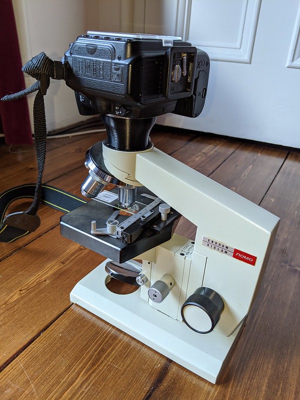 The actual project I wanted to do was attach my Nikon D90 SLR to my Lomo Biolam microscope. However, I had to detour into fixing the microscope first, as described here.