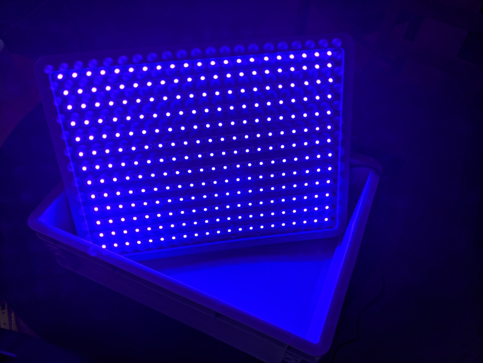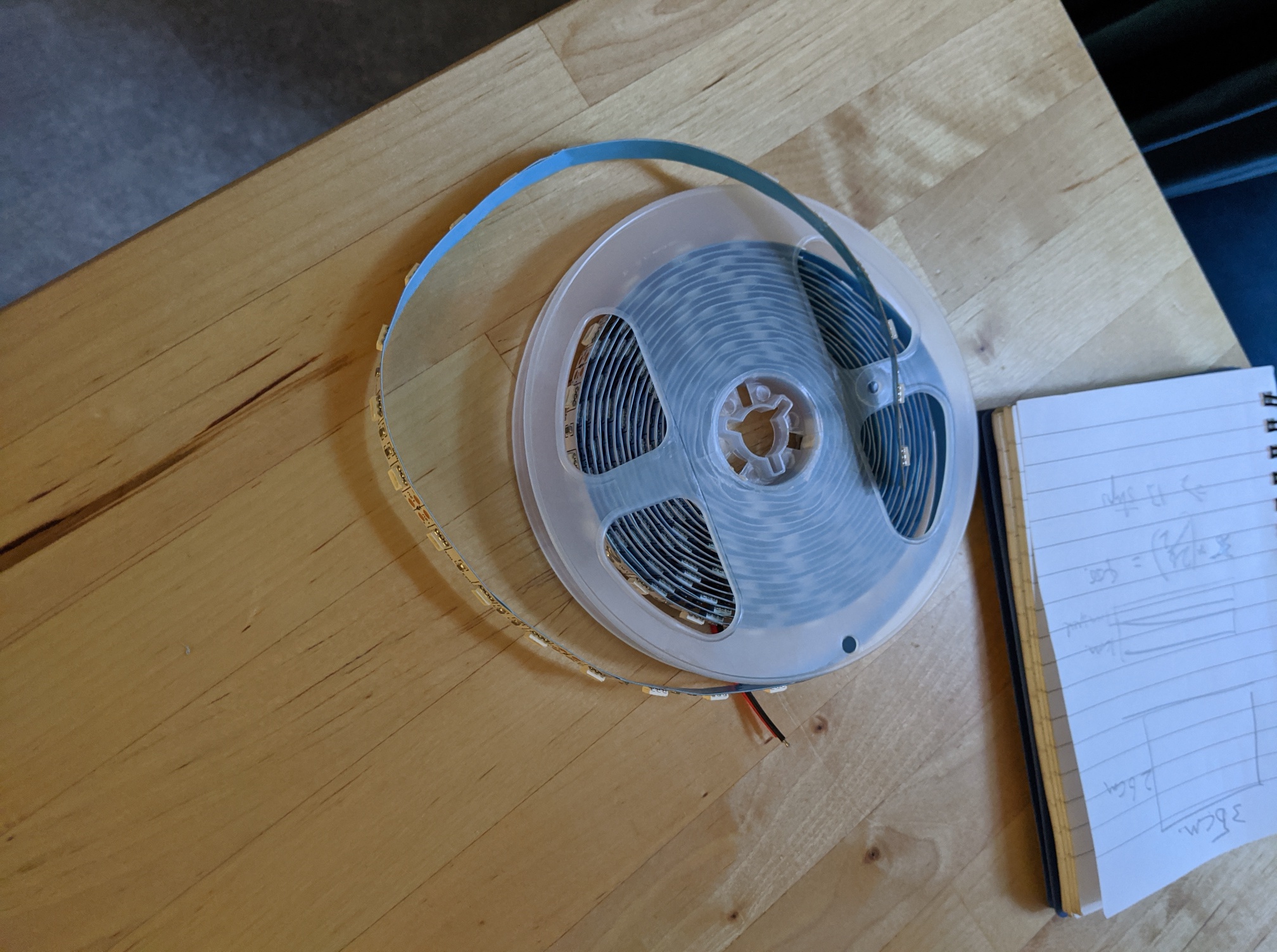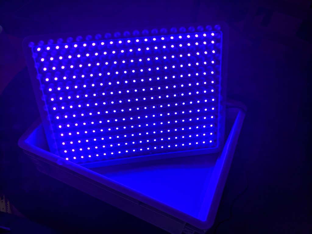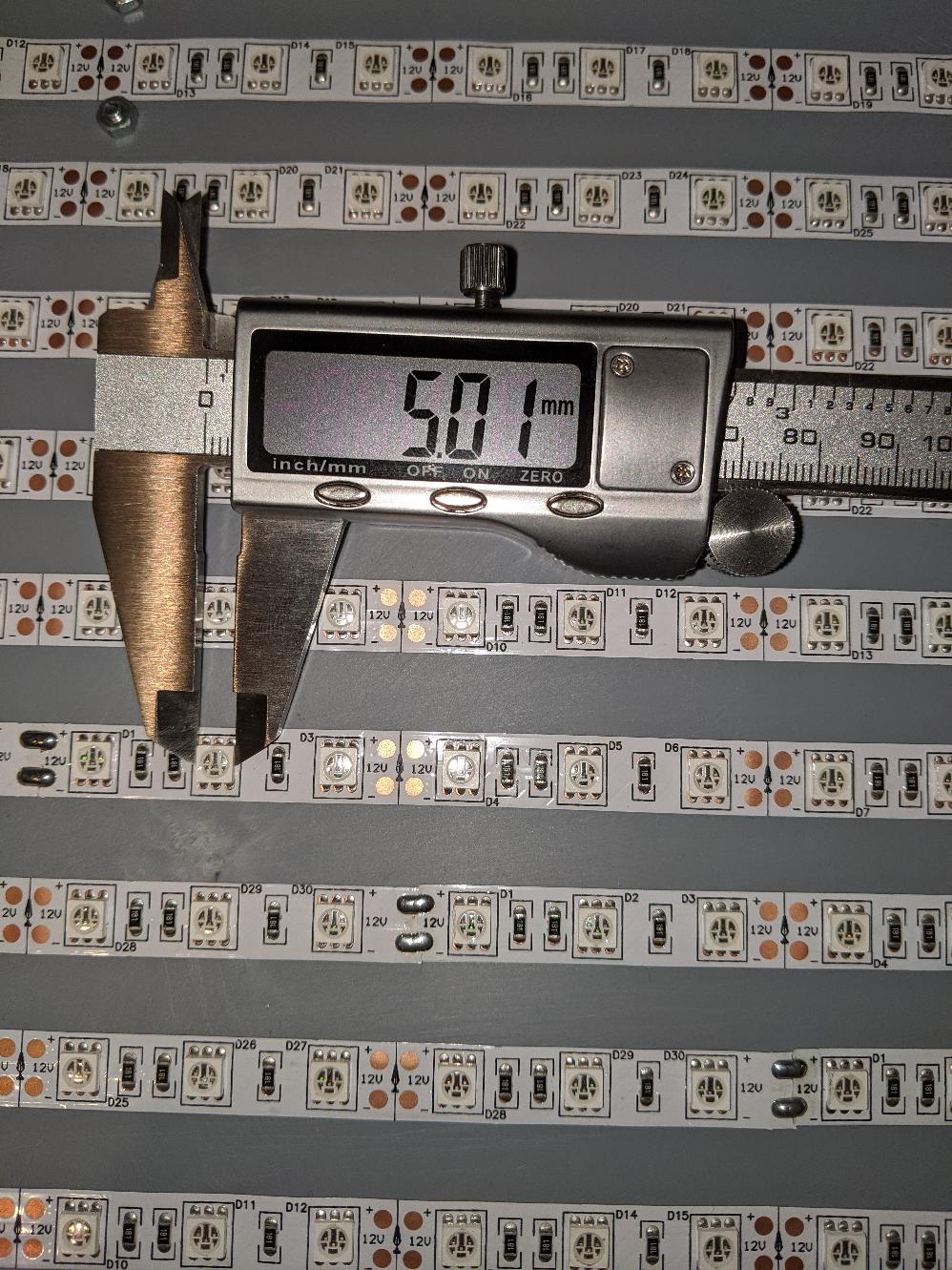 I acquired a 5M strip of ‘5050’ UV LEDs from Ebay, and a 12V 5A DC power supply. The original project specified ‘5050’ LEDs as they’re more powerful, but I don’t think it described why this was the case. As it turns out ‘5050’ is just the dimensions of the LEDs (5.0mm x 5.0mm in this case): larger LEDs => more UV output!