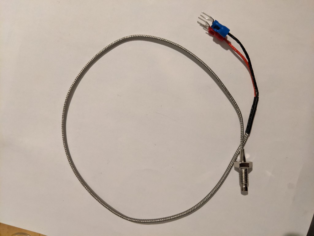 The above is a Type K thermocouple, fresh from Ebay. It works fine: I actually received two of them. Its the cheap’n’cheerful option amongst thermocouples in that temperature range.