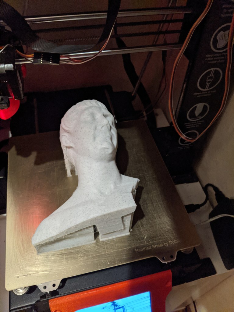 The support material had come unstuck. Plus, I was worried that the face might be marred by the support material. So I changed approach and printed the bust on its back instead: