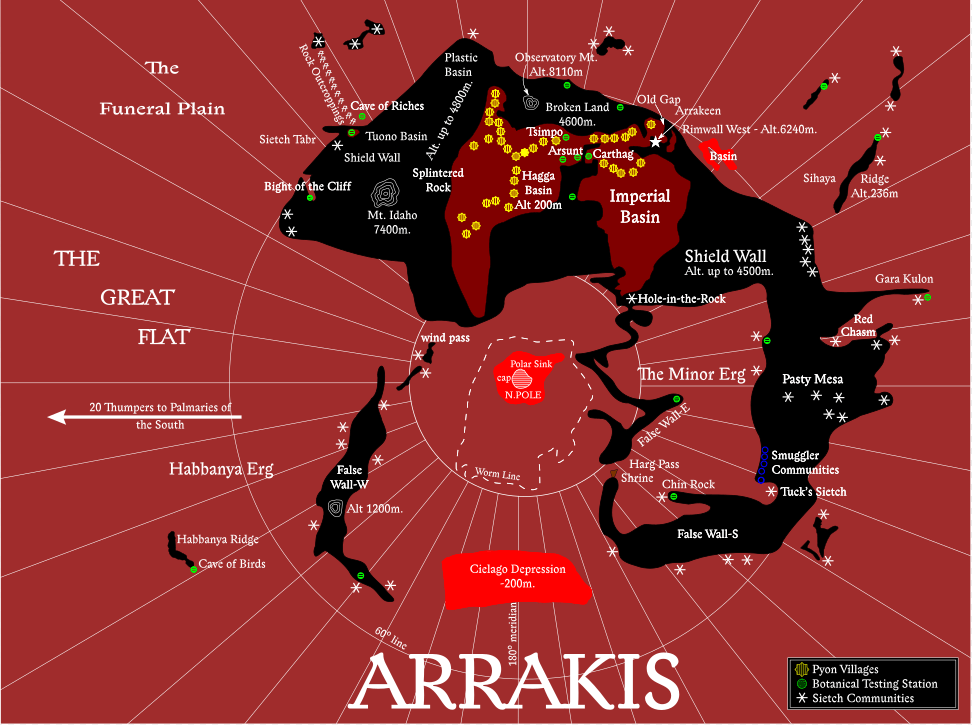 Unlike Mars, there’s no geo data for Arrakis as (a) it doesn’t exist, and (b) no one’s done it yet :D. But, there is a polar projection map! I found this Reddit thread where someone has taken a bitmap scan from somewhere and drawn a vector version. Here’s the original bitmap.