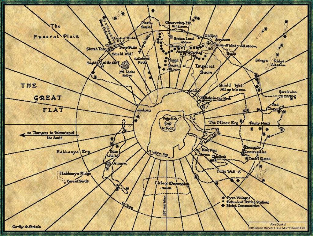 At the bottom left, there’s the original author’s name, Dorothy de Fontaine. Interestingly, it is spelt incorrectly, which implies this bitmap may have been reprocessed, or else an error in the original publication. I’d wondered if this came from The Dune Encyclopedia, but I consulted my copy, and there was no map: