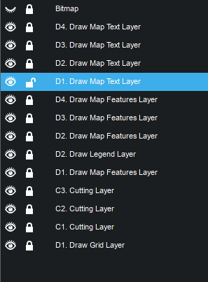 The layers starting with D are Drawing layers, those starting with C are Cutting layers. I use multiple Drawing layers at once; maintaining the separation between different things being drawn (even if on the same physical layer) really helps editing!