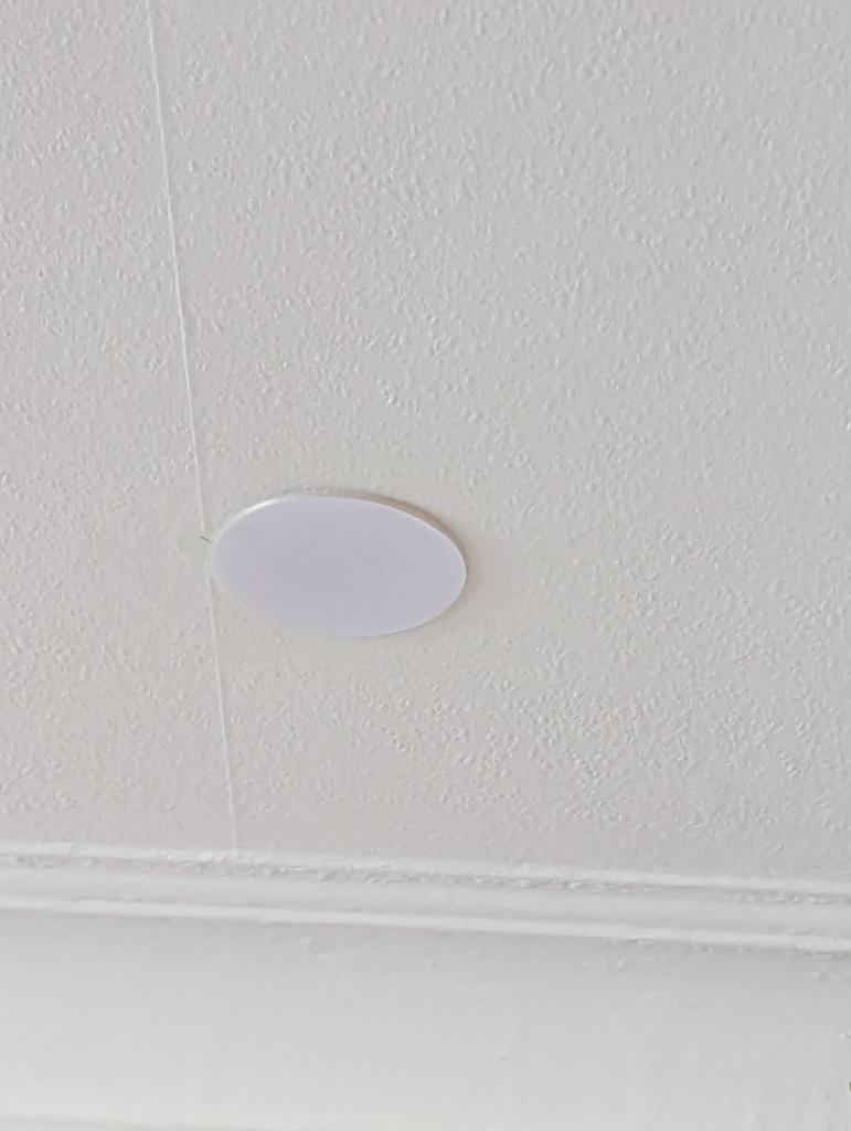 Basically the circular plate is visible on the ceiling, and its bolted into a rod+nut within the ceiling to stay attached. There’s a piece of string holding the two together so it doesn’t ping off into the ceiling void. Finally, the ethernet cable itself is zip tied onto the rod, again so it doesn’t get lost in the ceiling.