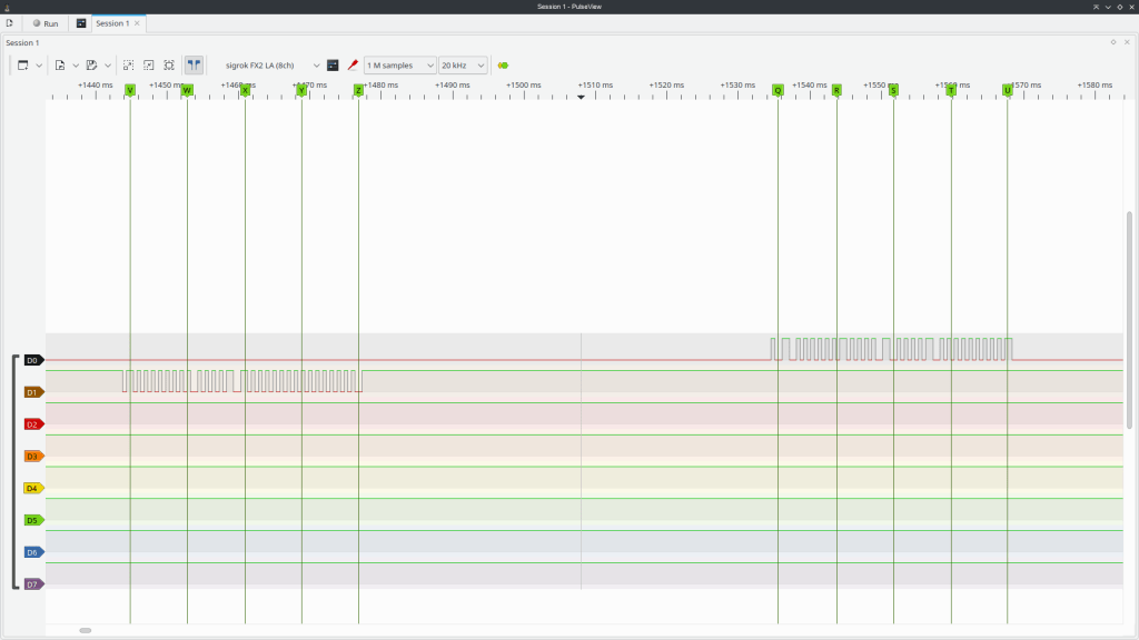 The analyser has 8 channels, so it’s not a problem to capture the data sent from the Pico and also the reply from the boiler at the same time. However…